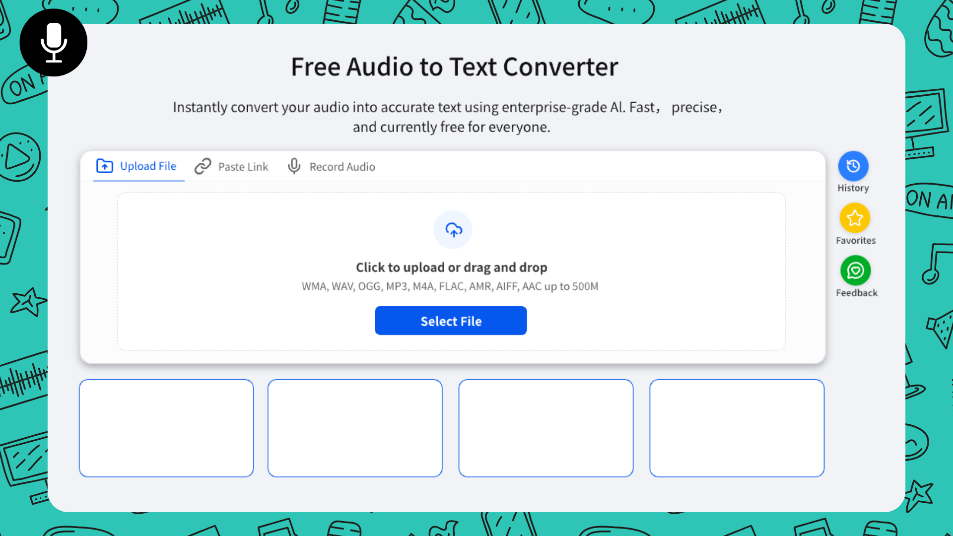 Versatile Inputs (Files, Live, & URLs): You can drag and drop massive local files (up to 500MB, supporting MP3, WAV, M4A, etc.) or use the Record Audio tab to capture live voice in your browser with real-time waveform visualization. The real game-changer is the Paste Link tab: input a YouTube or Google Drive URL, and Decopy directly fetches and transcribes the media. It is the ultimate YouTube to text AI.