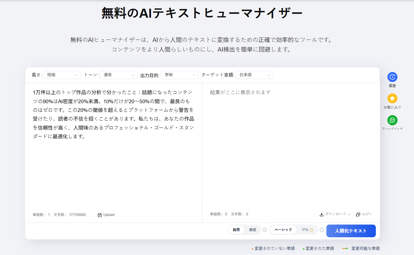 テキストを貼り付けるだけで、文章がどの程度AIらしく見えるかを数値で把握できる。改善前後の比較もしやすい。